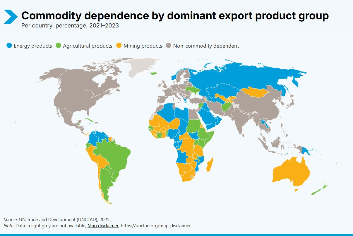 World commodity export dependence(, All commodities, per country, percentage, 2021–2023) :