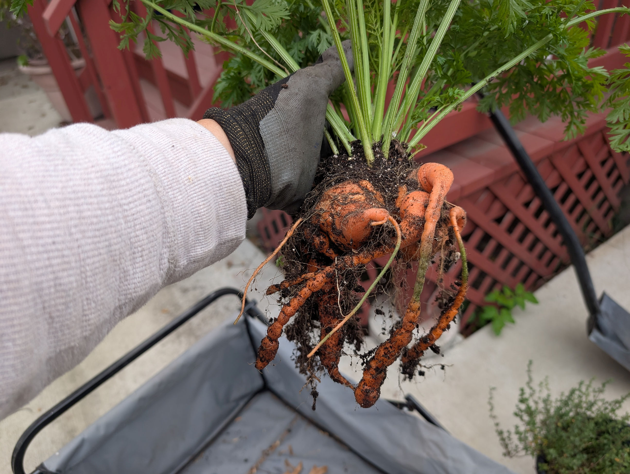 Planted a carrot top a few months back expecting it to flower and give me some seeds. I had to dig it up the other day because of moving and found this insane mess