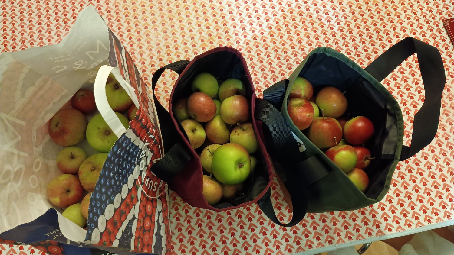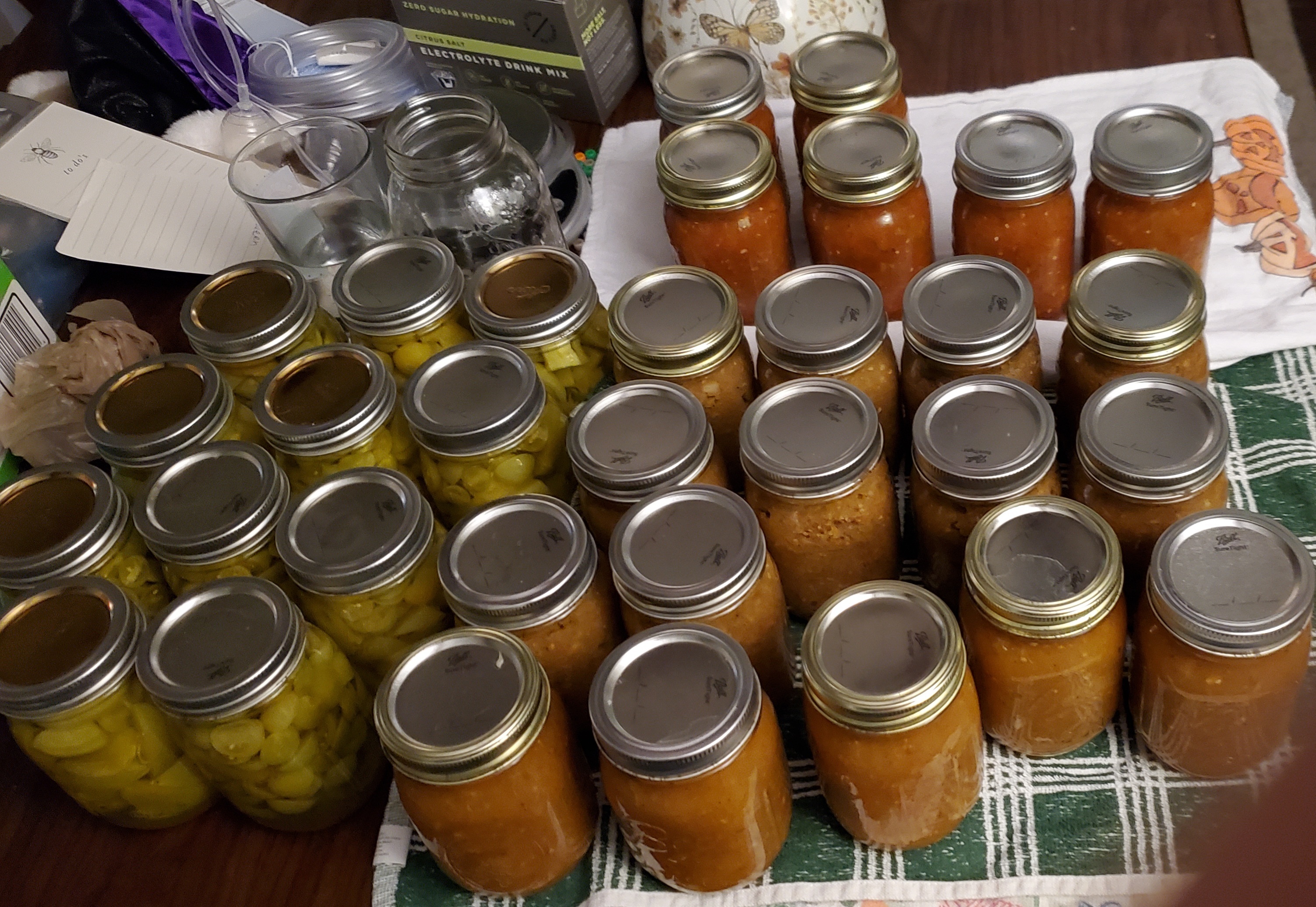 We made 11 jars of pickled green tomatoes and 21 jars of salsa. Jars are Pint sized (≈.5 L). Unpictured is the 4 gallons (≈16L) of blanched and frozen red tomatoes that we'll eventually turn into sauce.