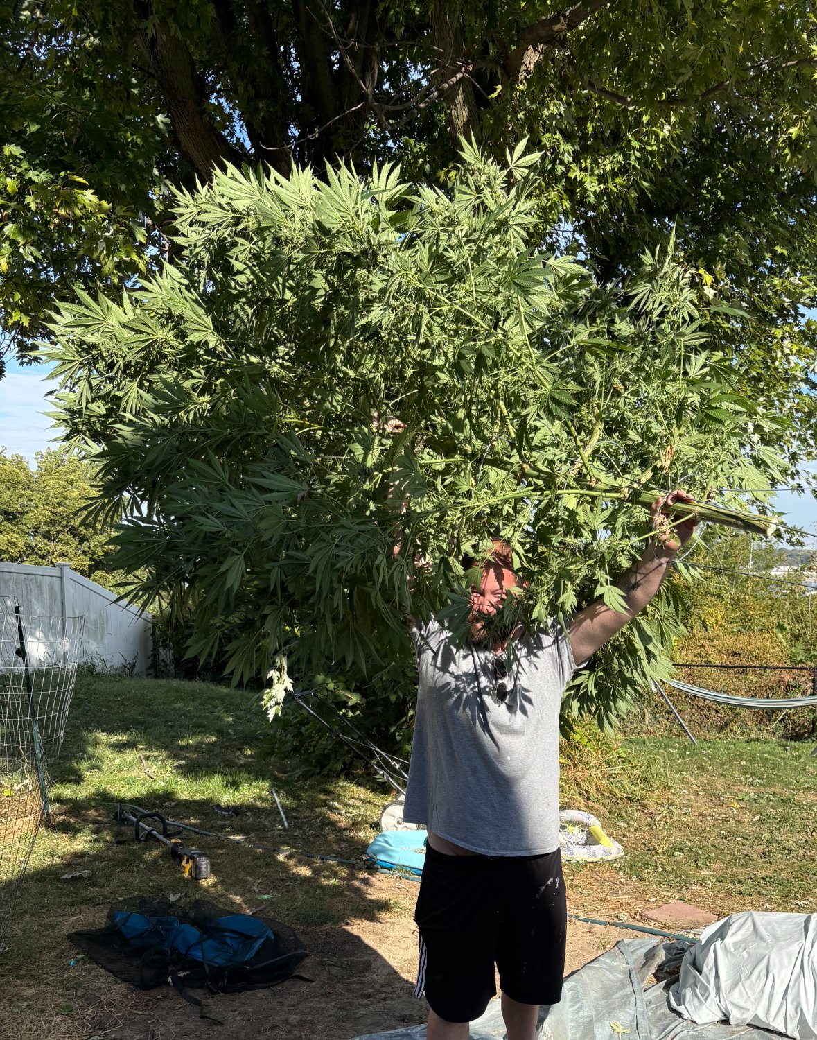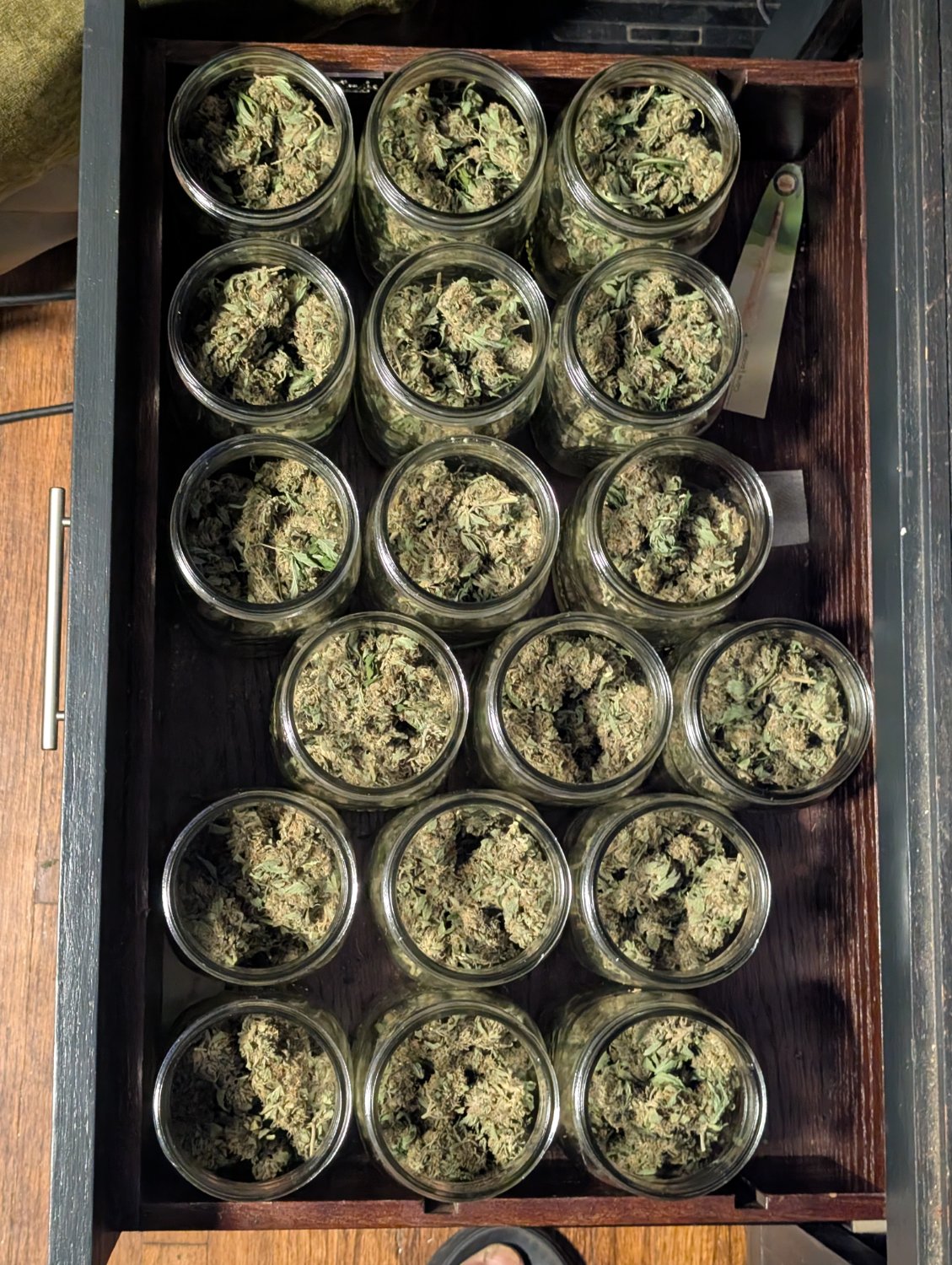 I actually got 19 ounces and a few stray grams but this drawer only fits 18 jars. I still have to wash my hash too, I have a bunch of trim. This is the most bountiful harvest I've ever had. Next year I'm going to trim this maple tree that shades my patch for part of the day, 19oz off a 10 foot plant seems low and my buds are pretty airy which I understand mostly comes down to light. Still, that's over a pound of some high grade boom draw that I grew in my back yard for basically free so I can't be that mad about it. 3 pounds is my self sufficiency target. "There's always next year"
