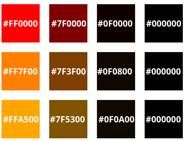 The colours in the second and third columns are 1/2 and 1/16 the value of the first. The fourth column is black for comparison. This was done by linear equivalence, not perceptual equivalence, so the oranges will look a bit brighter than the red.